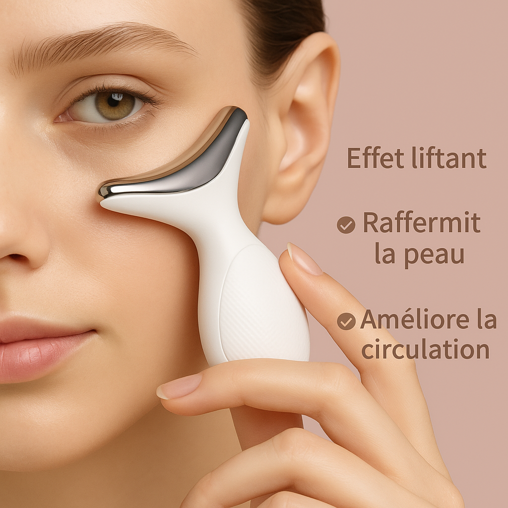 Appareil 3-en-1 pour nettoyer, raffermir et raviver le visage & le cou avec technologie EMS et thérapie lumineuse.